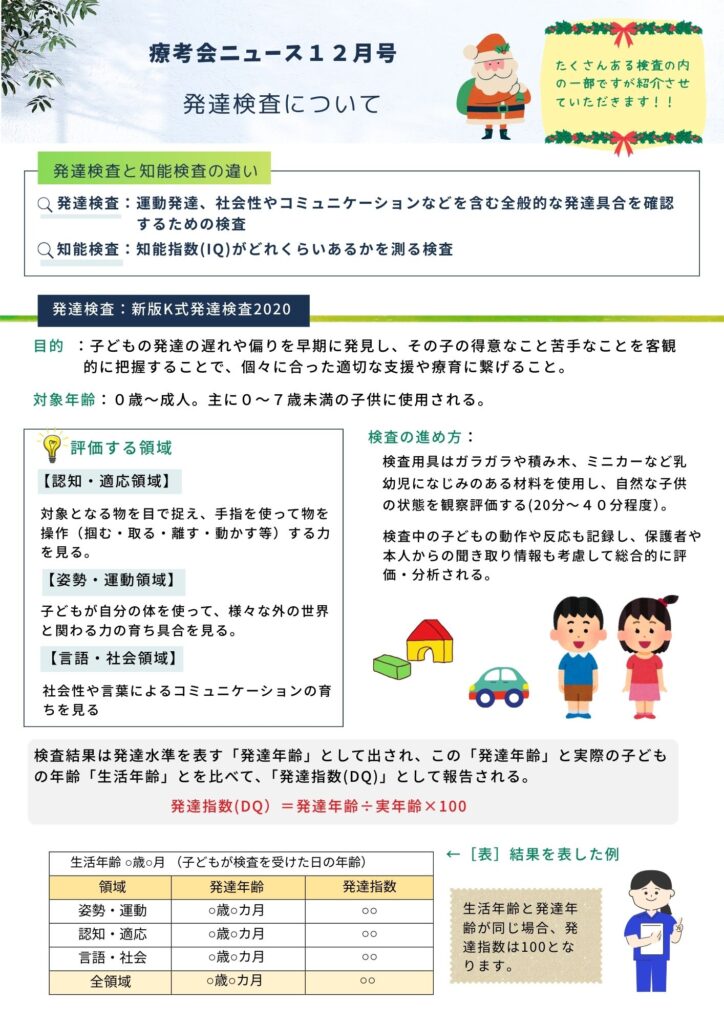2025/12/23 お知らせ 2025年12月 療考会ニュース12月号 会員の皆様、平素より当会の活動に ご理解とご協力を賜り、 誠にありがとうございます。 療考会ニュース12月号は発達検査についてです。 ぜひご覧ください。 療考会ニュース12月号→PDFはこちら